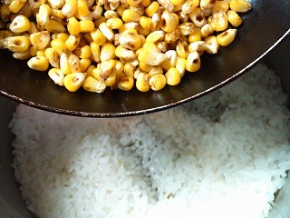 芯ごと炊き上げて、とうもろこしの風味づけをして、さらに、実の部分は別に炒めて後のせ。香ばしく炒めたトウモロコシの香りがいいです!