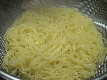 6.鍋にお湯を沸かし、焼きそばの麺をほぐし、水をきる。(写真右)