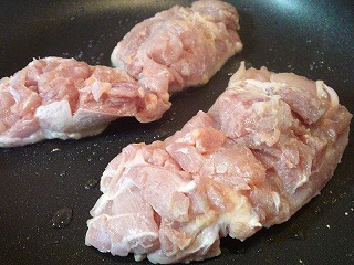 2.フライパンに少量の油をひいて火にかけ、鶏肉を皮目から入れて触らずにしっかりと焼き色をつけます(中火で7~8分)。
