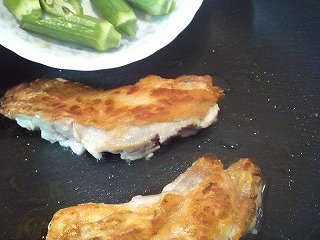 鶏肉を返し、オクラを加えて約3分焼きます。