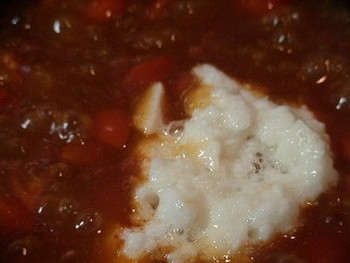 4.3に味付けの水・鶏がらスープの素・しょうゆ・酒・酢・ケチャップ・砂糖・トマトを入れ、puriebitiridon1最後に水溶き片栗粉を入れ、とろみをつける。