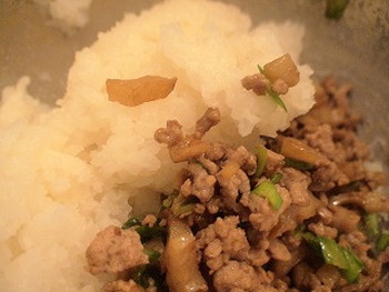 2.1のフライパンで、豚ひき肉を炒め、塩、コショウ、ショウガを加え火が通ったら、1のレンコンを加え入れ、しょうゆを入れて味付けをし、火を止めてニラを混ぜ合わせ、取り出す。motimizorenabe1