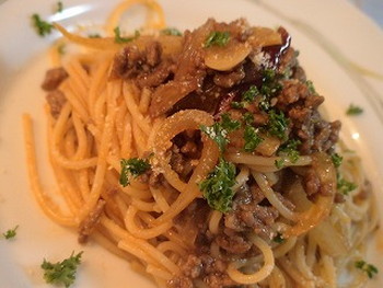 5.1の茹でたパスタと4のミートソースを絡ませて、さらにパルメザンチーズを加え、火を止める。