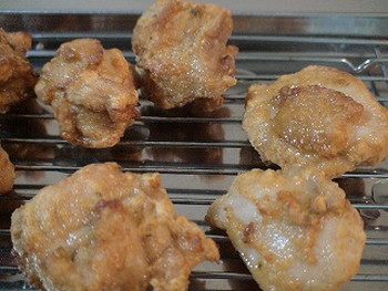※油の温度が肉を入れることで下がるので、油の温度を戻し上げて、鶏肉を2度揚げすることで、カリッとジューシーに仕上げる!