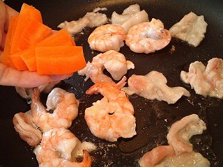 4.フライパンに油(大1)をしき、豚バラ肉、エビを中火で炒め、豚肉とエビの表面に色が付く程度まで炒めたら、ニンジンを加え炒めます。