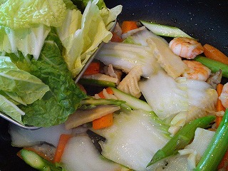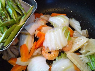 ツヤが出てきたらハクサイの芯、アスパラガス、タケノコを加え炒めます。