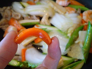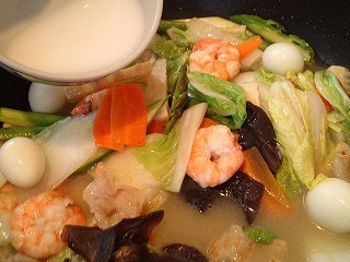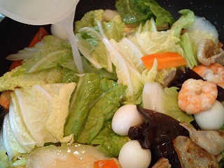 ニンジンが弓のようにしなってきたら、ハクサイの葉、キクラゲ、ウズラの卵の順に加えて炒めます。