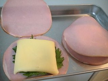 1.ロースハムにスライスチーズ、青ジソをのせ、ロースハムを重ねる。