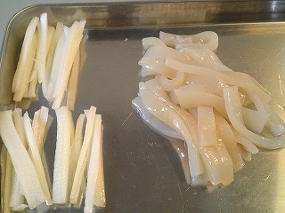 1.いか(150g)は皮をむいて6cm長さ、3mm幅の細切りにし、セロリ(50g)は3mm角の細状に切りします。