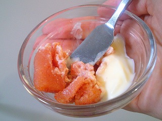 3.ソースのマヨネーズ(30g)、中身を取り出した辛子明太子(30g)を混ぜ、トマトケチャップ(小2)、塩、こしょう(各適量)、牛乳(大1)を合わせます。