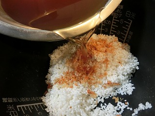 4、炊飯器に干しえび、洗った米(2合)。(3)を入れて炊きます。