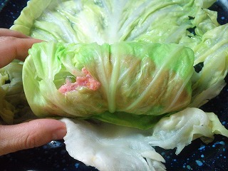 4.キャベツ1枚を広げて芯の部分を軽く叩き、3を置いて包み、もう1枚で更に巻き、爪楊枝で止めます。