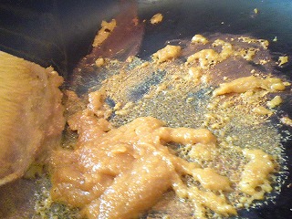 4.みそに酒を混ぜ、フライパンに広げて中火で香ばしく焼き、だしを加えて溶きのばし、ボウルに入れて冷まします。