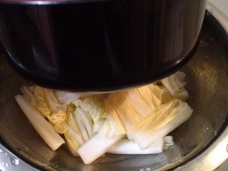 1.白菜(150g)の軸は4cm長さ、2cm幅の短冊に切り、葉は3cm角に切り、ボウルに入れて塩をまぶし、軽い重しをして10分置く。