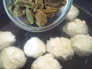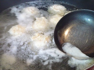 にだしの水(800ml)を煮立て、昆布茶(小1/2)を加え、弱火にして3をスプーンで団子に取って入れ、アクを取ります。