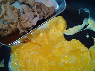 3.鍋の油をふき取り、油(大さじ2)を加えて中火でよく熱し、溶き卵を加えてゆっくり混ぜながら半熟まで火を通し、2の豚肉を戻し加えて仕上げます。