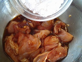 1.鶏もも肉は筋を切って2cm角に切り、ボウルに入れ、鶏肉の下味の酒、みりん、しょうゆ、しょうがとにんにくのみじん切り、柚子こしょうを加えて手でもみ、10分置きます。