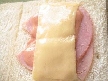 3.食パンにスライスチーズをのせ(中央に)、ロースハム(右斜めに)、2のソース、ゆで卵2枚(中央に)、2のソース、ロースハム(左斜めに)、スライスチーズ(中央に)の順に重ねる(写真右)。