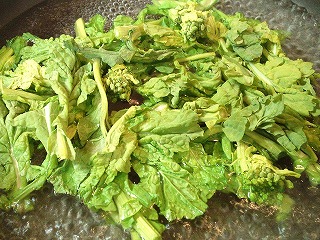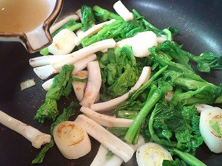 ※いかの表面が白っぽくなれば、菜の花を加えて仕上げる。