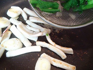 .鍋に油(適量)を熱し、1のいか、長ねぎ、しょうがの薄切り(5g )を強火で炒め、いかにほぼ火が通ったら、菜の花を入れて炒めます。