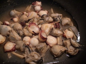 4.同じ鍋に油を熱してニンニク、カキを中火で炒め、味つけ調味料の酒を加えて強火にし、しょうゆ、オイスターソース、塩、コショウ、タコを加えて少し煮つめる。(煮詰める時は中火)