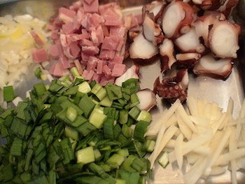 1.カキは塩水で洗って3等分に切り、タコは2~3mm幅の薄切りにする。
