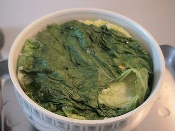 ボウルの縁からはみ出ている葉を内側に折り込みフタにする。最後に葉をのせて、しっかり押さえて、オーブンレンジのスチーム機能で30分蒸す。蒸し器の場合は約45分ほど蒸す。