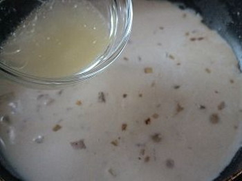 8.5のミルフィーユ蒸しから出る「蒸し汁」を7のホワイトソースに加える。塩・コショウで味を調える。