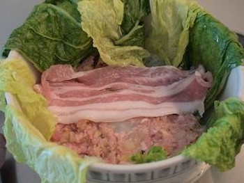 4.耐熱ボウル(直径15cm程)の内側に薄く油を塗る。1の外側の葉を最初に少しはみ出すようにボウルに敷く。次に3の肉ダネを広げる。次に豚バラ肉を重ね、塩・コショウをふる。