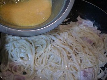 5.少しとろみがついたら、塩を加えて混ぜる。carbo-kentaro3水気を切ったパスタを加え、ザッと和える。味をみながら塩でととのえる。