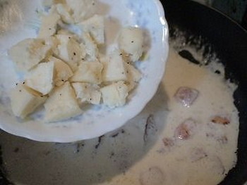 4.にんにくが色づいてきたら生クリーム、牛乳を加える。ゴルゴンゾーラチーズをちぎりながら加える。