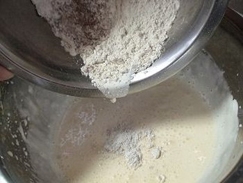 5、4に3を一気に振るい入れ、ゴムベラで切るように底からサックリと混ぜる。粉っぽさが無くなったらチョコレートの3/4量、くるみの2/3量を加えてザッと混ぜる。