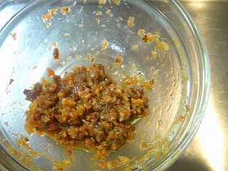 1.桜エビ細かく刻む。アンチョビはペースト状になるまでみじん切りにし、ナンプラーを加えて混ぜます。