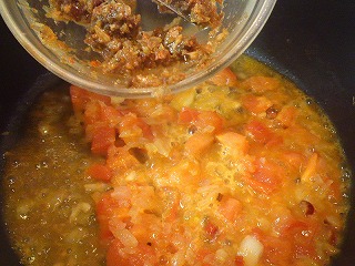 4.さらにトマトを加えて炒め、トマトが崩れてきたら1のエビだれ(小さじ1)を加えて炒めます。