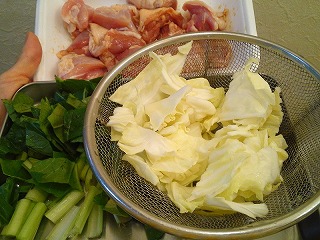6.キャベツは小さめの一口大に切り、小松菜は根元を切り落として2㎝長さに切ります。玉ねぎ、にんにくはすりおろします。