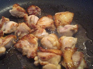 7.フライパンを熱してサラダ油(大さじ2~3)をひき、鶏肉を皮を下にして入れて強火で焼き、全体にしっかり焼き目がついたら取り出します。