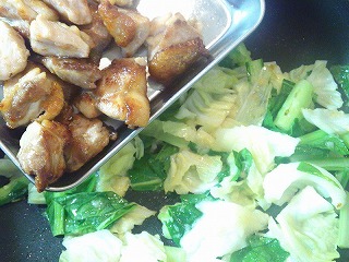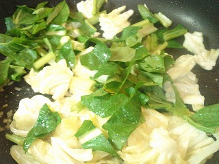 玉ねぎに火が通ったらキャベツを加えて炒め、透き通ったら小松菜を加えて炒めます。