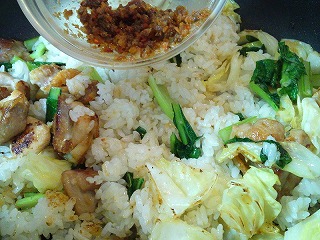 9.少ししんなりしたら7の鶏肉を戻し入れ全体が馴染んだら、ご飯を加えて、木ベラでほぐすように炒めます。