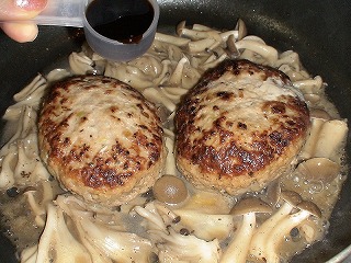 ※水を注ぎ蒸し焼きにすることで、ふっくら仕上がる!また、きのこを一緒に蒸し焼きするので、きのこの旨みが、ハンバーグに染み渡る!