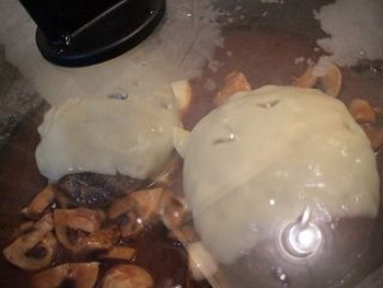 7.水気を切り、bのソース、マッシュルームを加えて煮る。