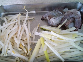 もやしはひげ根を取り、長ねぎは5cm長さの細切りにします。