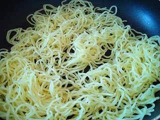 4.フライパンにサラダ油(大さじ1)を熱し、麺を入れて炒め、大きなボウルに取り出します。