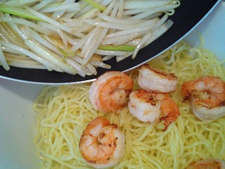 *エビとネギの和えそばを作る*