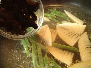 タケノコ水煮はスライスし、きくらげは食べやすい大きさに切ります。