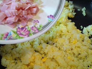 .全体に油が回ったらハムを加えて炒めます。