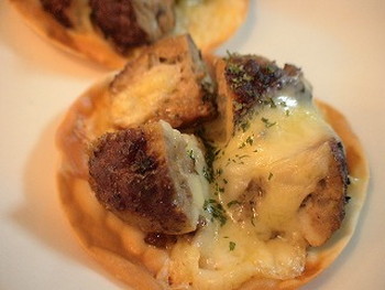 2.餃子の皮に1を塗り、ミニバーグ(1枚にミニバーグ1個分)、ピザ用チーズをのせオーブントースターで3分ほど焼く