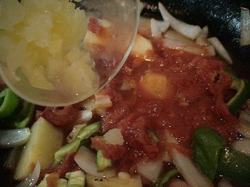 6.じゃがいも、ピーマン、白ワイン、ブイヨンスープ、ホールトマト(潰す)、パイナップル(粗みじん切り)を加えて煮る(写真右)
