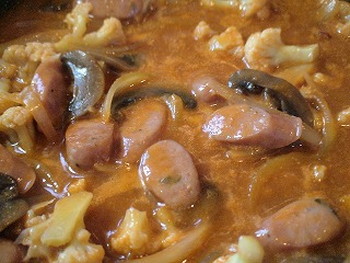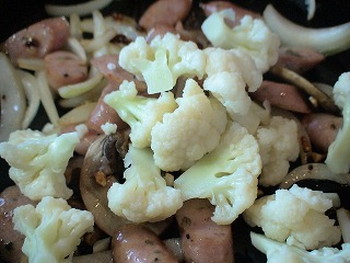 まろやかなナポリタンでした。カリフラワーの食感がアクセントになります。枝の部分を除いて、もっと小房に分けてたら、潰しやすかったようです。