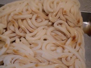 3.ゆでうどんを袋から取り出し、しょう油をまぶしかける