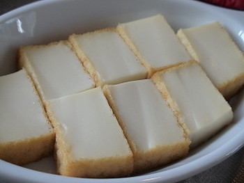 1.厚揚げ(1枚)は縦半分に切ってから、厚さ1cm(8等分くらい)に切る。